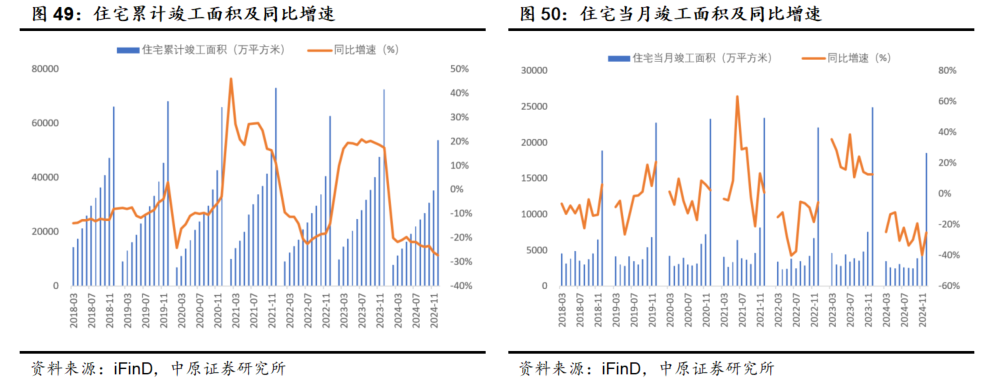 住宅累计、当月竣工面积延续负增长,当月竣工面积较上月大幅收窄,随着“保交房”、“白名单”项目的推进,竣工取得了积极成果,未来有望逐步企稳。2024年12月全国住宅竣工面积18544万平方米,同比下降25.38%,降幅较上月大幅收窄;1-12月全国住宅累计竣工面积53741万平方米,同比下降27.4%,降幅较上月略有扩大。