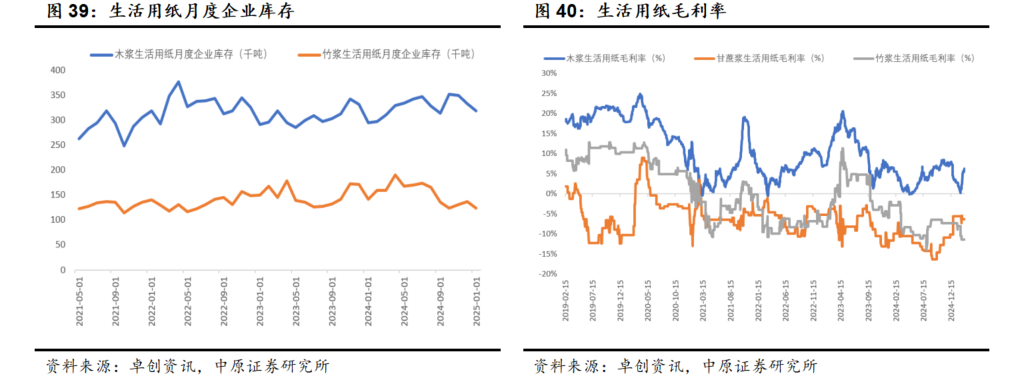 从盈利能力来看,木浆生活用纸毛利率上升,主要由于原料木浆价格高位运行,引起木浆生活用纸成本增加,但小于纸价涨幅所致。2025年2月28日,木浆、竹浆生活用纸日度毛利率分别为6.25%、-6.39%,较上月末分别+4.37pct、-0.85pct。