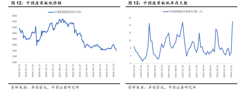 2月废黄板纸价格下跌,根据卓创资讯,导致价格下跌的原因包括:一是2月1日特朗普宣布对中国商品加征10%关税,导致市场对出口商品纸包装需求预期下降,纸厂主动下调废黄板纸采购价格;二是下游纸厂成品纸库存上升较快,部分纸厂下调废黄板纸采购价格。2025年2月28日,废黄板纸均价为1403元/吨,较上月末下降5.59%,月内价格继续上涨持续下降;2025年1月,废黄板纸库存天数为15天,环比+8天,库存显著上升。