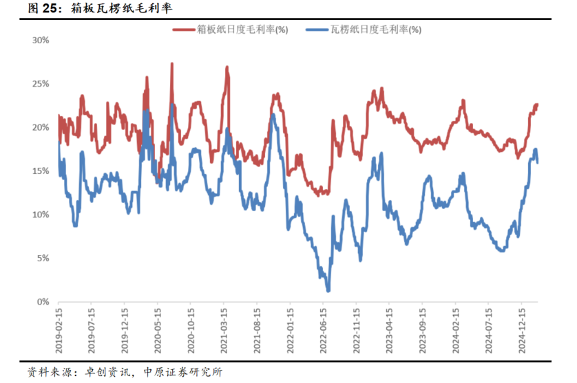 从盈利能力来看,2025年2月末箱板纸毛利率略上升、瓦楞纸略下滑。2025年2月28日,箱板纸、瓦楞纸毛利率分别为22.65%、15.71%,较上月末分别+1.01pct、-0.7pct。