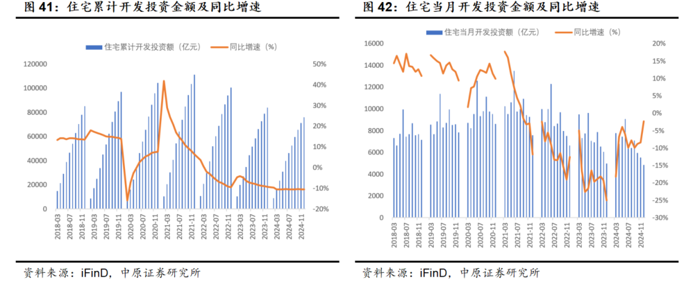 住宅累计、当月开发投资金额延续负增长,当月降速明显收窄,显示一定程度的改善,考虑到市场需求不足、土地成交规模缩量、企业资金压力大、市场库存偏高等因素影响,房地产开发投资规模较难有大幅度回升。2024年12月全国住宅开发投资金额4850亿元,同比下降2.37%,降幅较上月明显收窄;1-12月全国住宅累计开发投资金额76040亿元,同比下降10.5%,降幅较上月持平。