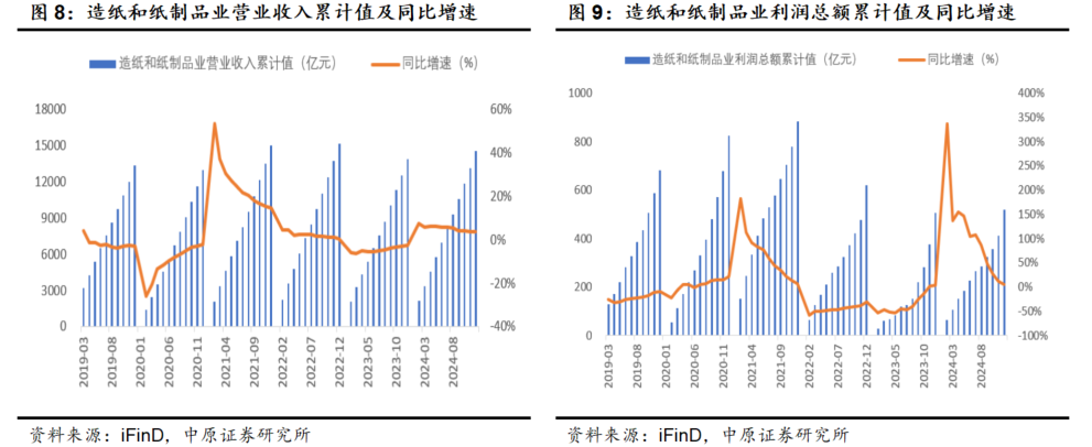 2024年1-12月,我国造纸和纸制品业规模以上工业企业营业收入累计14566.2亿元,同比增长3.9%;2024年1-12月利润总额累计519.7亿元,同比增长5.2%。
