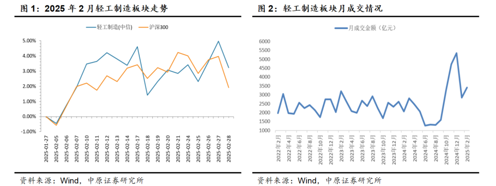 2025年2月,上证指数上涨2.16%,沪深300指数上涨1.91%,中信轻工制造行业指数上涨3.23%,跑赢同期沪深300指数1.32pct,在中信30个一级行业中排名第17名,涨幅排名居中。轻工制造板块2月成交额3403.74亿元,日均成交额189.10亿元,环比增长20.01%。