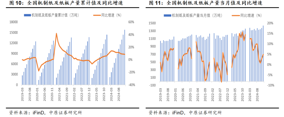 2024年12月全国机制纸及纸板产量1440.90万吨,同比增长4.9%,增速回升;1-12月产量15846.89万吨,同比增长8.6%。