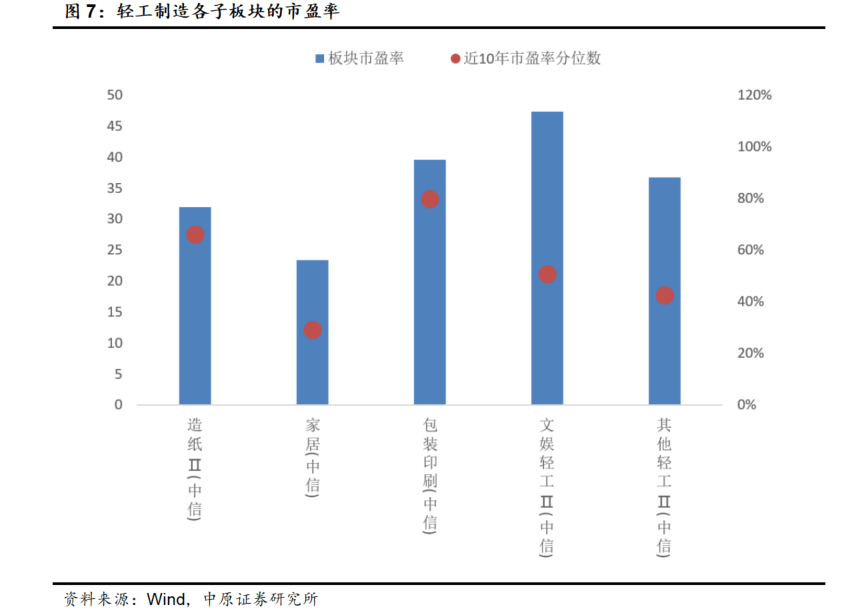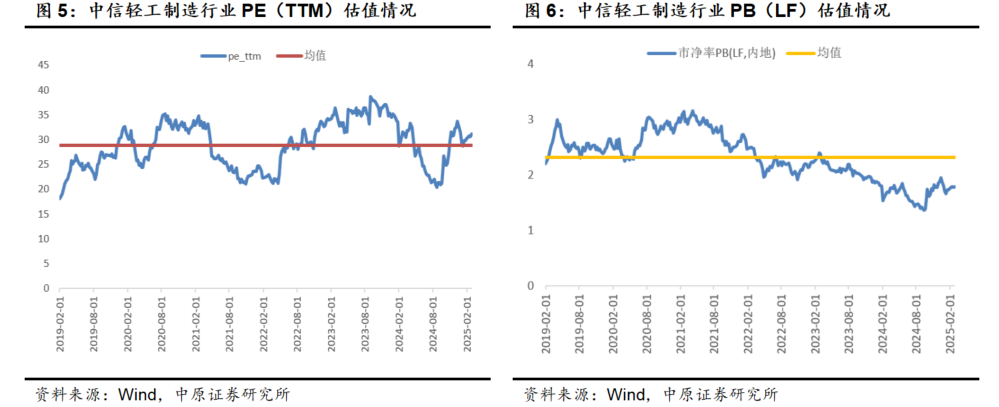 截至2025年2月28日,板块的PE(TTM)为30.10倍,处于近十年41.42%分位,在30个中信一级行业中排在第16位;PB(LF)为1.79倍,处于近十年7.59%分位。细分子板块造纸、家居、包装印刷、文娱轻工、其他轻工的PE(TTM)分别为32/23/40/47/37倍,分别处于历史66%、29%、80%、51%、42%分位,其中家居、其他轻工估值仍处于历史偏低水平。