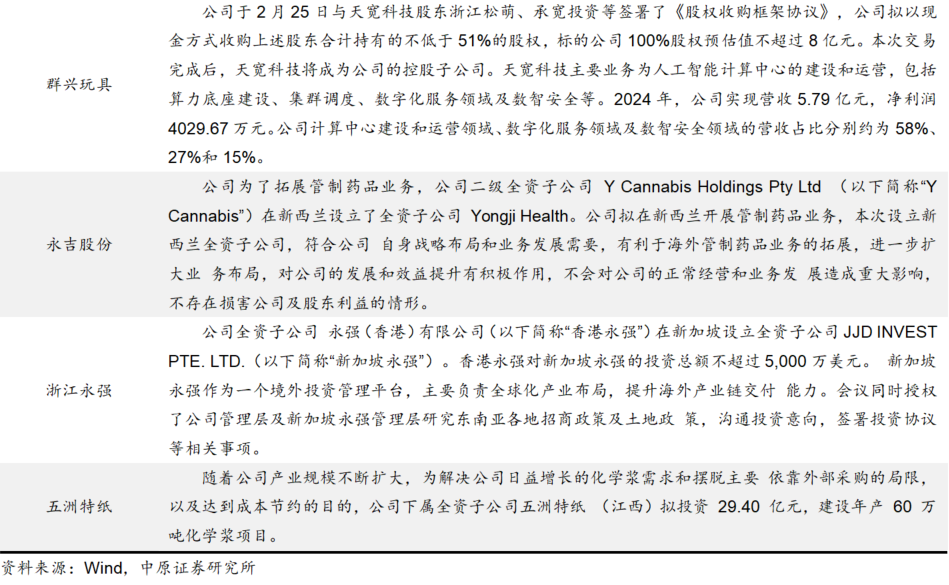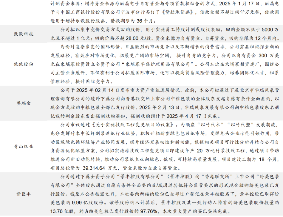 造纸:受到库存上升和出口预期下降影响导致废黄板纸价格下跌,中国进口针叶浆、阔叶浆价格2月份经历先涨后跌,外盘报价上涨,继续偏强运行;包装纸价格先涨后跌,成本面缺乏支撑,库存压力增加;文化纸受益于成本端浆价偏强运行,部分纸厂公布涨价,涨价预期下业内信心提振,双胶纸价格小幅上移,双铜纸价格偏强运行;近期海外大厂继续上调针叶浆及阔叶浆报价,智利Arauco对2025年3月针叶浆银星报价825美元/吨,较上月上涨10美元/吨,阔叶浆明星报价610美元/吨,较上月上涨20美元/吨,预计浆价未来仍将上行,进而带动文化纸、白卡纸、生活用纸等浆纸系纸品价格提升,建议关注林浆纸一体化头部企业太阳纸业、特种纸企业仙鹤股份、华旺科技以及卫生用纸企业百亚股份。