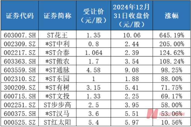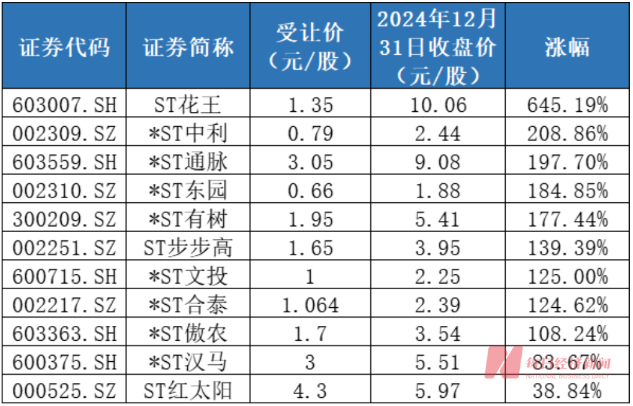 截至2024年12月31日收盘,如果用参与重整时的受让价来衡量盈亏,那么上述28家产业投资人皆处于浮盈状态。其中,ST花王的产业投资人浮盈高达645.19%,属于当之无愧的“最强盈利王”。