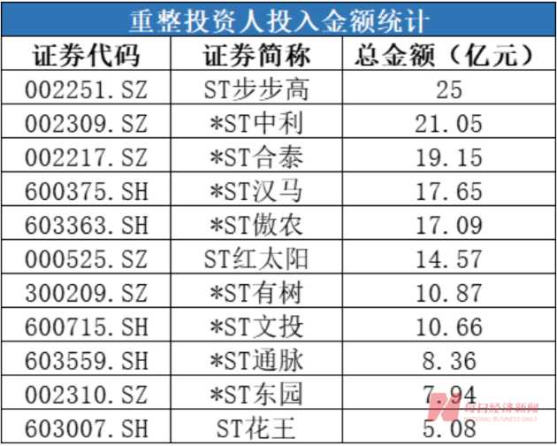 从重整投资人投入的金额来看,从5亿元到25亿元不等,大部分都在10亿元以上,重整投资人合计投入金额超过150亿元。其中,重整投资人投入金额最高的是ST步步高,达到25亿元;重整投资人投入金额最少的ST花王,仅5.08亿元。
