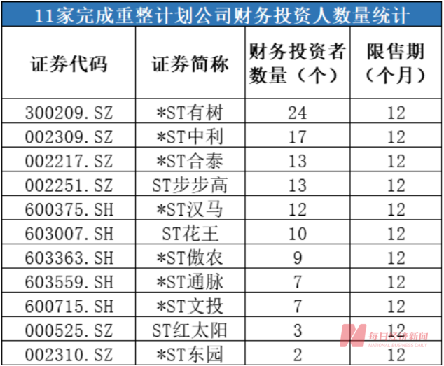 11家重整计划执行完毕的公司中,有6家公司财务投资人数量超过10个。其中,财务投资者数量最多的是*ST有树,高达24家;数量最少的是*ST东园,仅2家。相较于产业投资人,财务投资人的限售期明显偏短,皆为12个月。