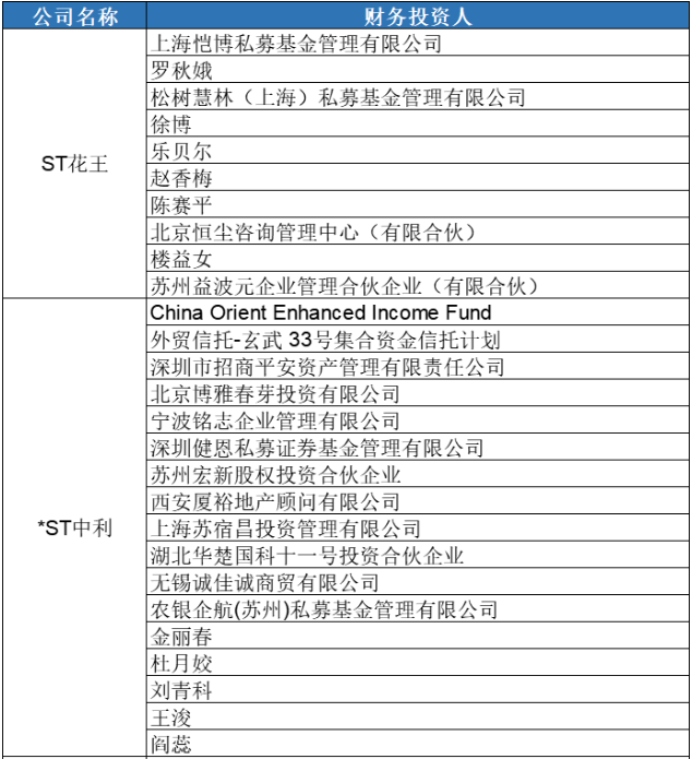 从参与重整时的受让价格来看,11家重整计划执行完毕的公司中,有3家公司财务投资人的受让价和产业投资人一致,分别为*ST合泰、ST花王和*ST傲农;其余8家公司的财务投资者的受让价都要高于产业投资人。
