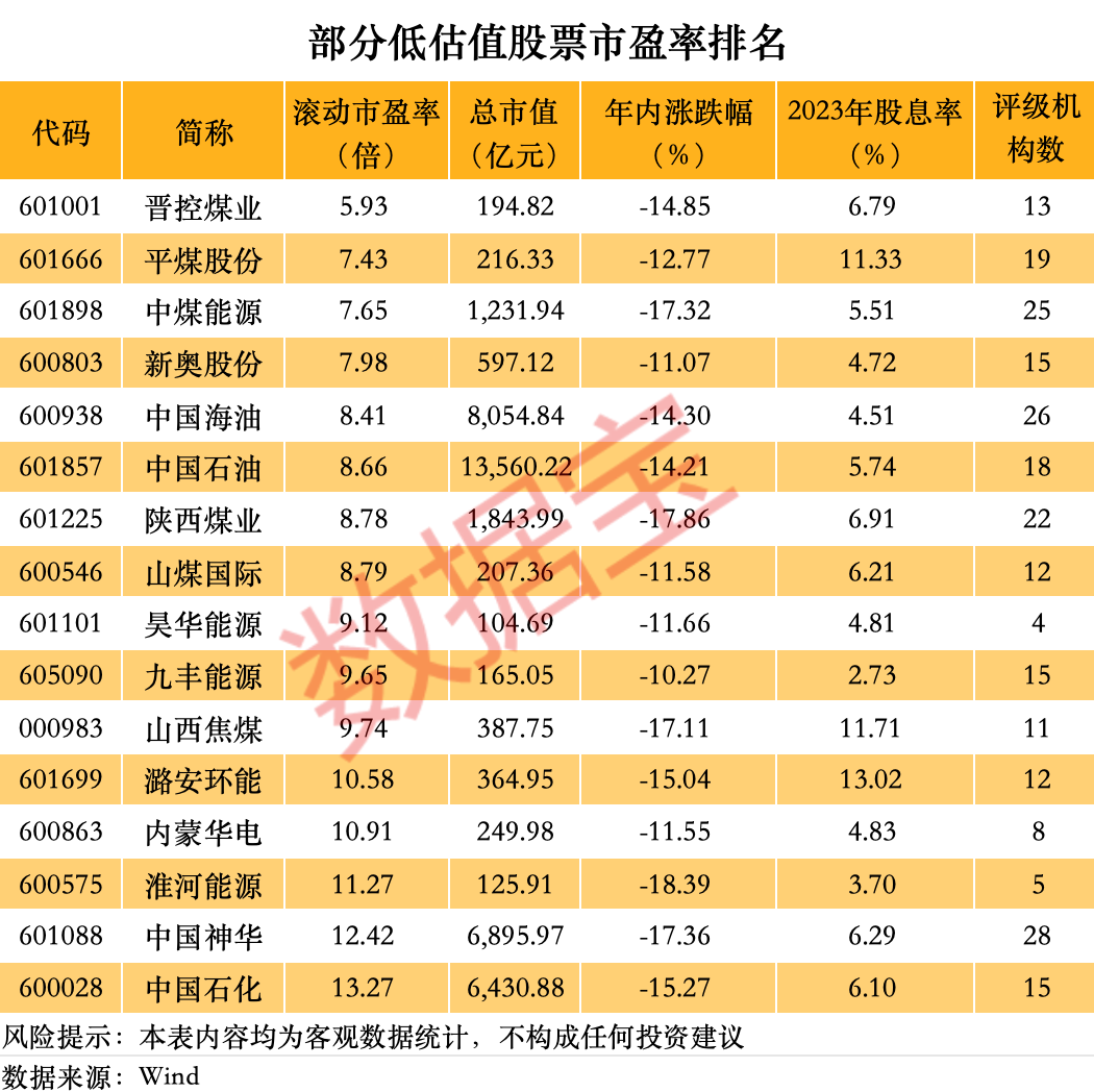 证券时报·数据宝筛选出一批优质低估值、年内跌幅较大的资源股。这些个股具有评级机构数在3家以上、滚动市盈率低于15倍、最新股息率在2%以上、年内跌幅均超10%,合计有16只个股。其中晋控煤业市盈率最低,不足6倍。此外,平煤股份、中煤能源、新奥股份等个股市盈率均低于8倍。