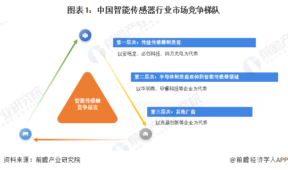 我国智能传感器的市场竞争层次可分为传统传感器制造商、半导体厂商和其他厂商。传统传感器制造商致力于传统传感器的智能化研发;半导体厂商则基于成熟的半导体工艺,发展智能传感器技术;其他厂商进行收购等方式进入智能传感器领域。
