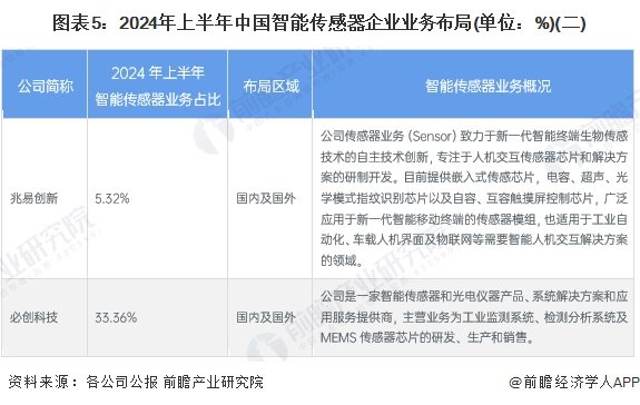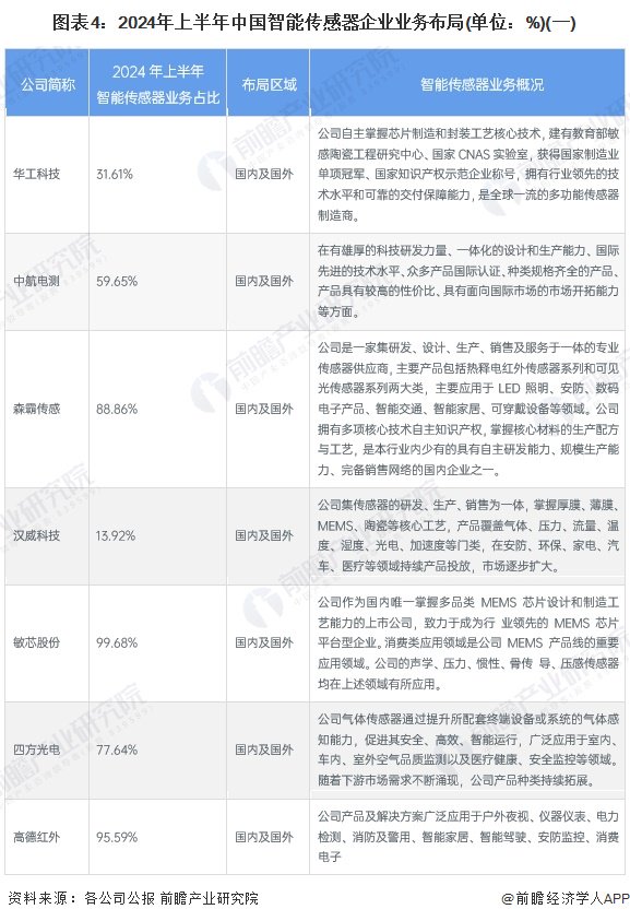 在智能传感器上市公司中,公司智能传感器业务在国内外均有布局。从智能传感器业务产比来看,敏芯股份专注于传感器业务,2024年上半年业务占比达到99.86%。其次,高德红外智能传感器产品占比较高,应用于广泛应用于户外夜视、仪器仪表、电力检测、消防及警用、智能家居、智能驾驶、安防监控、消费电子,同样具有较强的竞争优势。