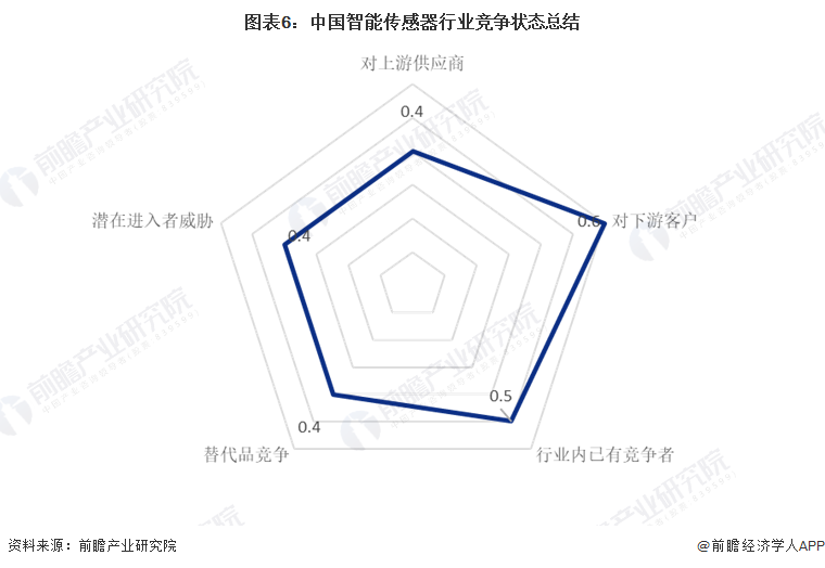 智能传感器制造行业的关键要素主要是其上游原材料,包括:有色金属、塑料及半导体。国内有色金属、塑料及半导体行业应用较为广泛,价格遵从市场选择,因此供应商议价能力相对较弱;国内智能传感器高端产品主要集中在几家世界知名品牌厂商手里,因此在高端产品市场,智能传感器制造商企业的议价能力较强。而对中低端的产品,由于生产中低端产品的企业角度,同质化竞争较严重,因此在中低端产品市场,智能传感器制造商企业的议价能力较弱。