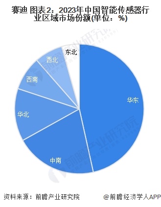 从中国智能传感器产业地区集聚情况来看,根据赛迪的数据,2023年中国智能传感器产业厂商主要在华东地区集聚,2023年市场份额占比超46%,其次是中南地区,占20.5%。