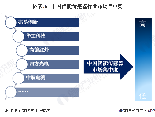智能传感器制造行业逐步进入成熟阶段,形成了一批具有一定技术的领先企业,但由于厂商数量较多,行业整体呈现分散竞争的情况,低端产品的生产厂商尤为密集,行业竞争较为激烈。