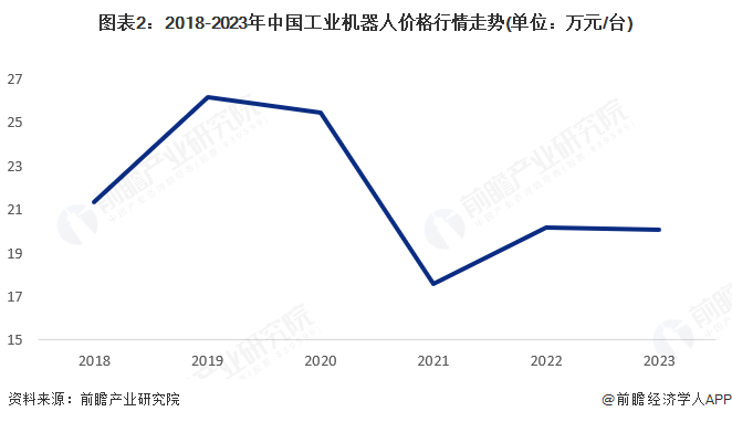 从我国工业机器人价格行情走势来看,2018年以来我国工业机器人价格在20万上下波动变化。截至2023年我国工业机器人平均销售价格约为20.08万元/台。