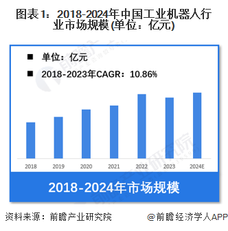 按照国际标准化组织(ISO)ISO8373-2021的定义,工业机器人是自动控制、可重新编程的多用途机械手,可在三个或更多轴上编程,可固定在适当位置或固定在移动平台上,用于工业环境中的自动化应用。2023年中国工业机器人行业市场规模受下游需求减少影响小幅下降至550亿元,五年行业复合增速为10.86%。初步估算,2024年随着经济的回暖,中国工业机器人行业市场规模也小幅回暖达到近600亿元。