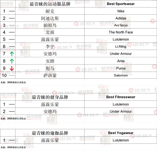 耐克连续三年蝉联高净值人群最青睐的运动服品牌第一名,阿迪达斯稳居第二。功能性服饰始祖鸟、北面和露露乐蒙分列第三至第五名,李宁排名第六。安德玛和安踏分别上升一位,排名第七和第八。