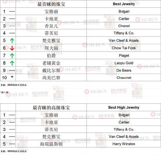 宝格丽连续七年稳居高净值人群最青睐的珠宝品牌,卡地亚紧随其后,已连续四年排名第二。其次依次是香奈儿、蒂芙尼、梵克雅宝和周大福。伯爵和老铺黄金分列第七、第八,老铺黄金从去年第十位跃升至第八。尚美巴黎新上榜,位列第十,仅次于排名第九的戴比尔斯。宝格丽同时荣膺最受青睐的高级珠宝品牌,其次依次是卡地亚、蒂芙尼、梵克雅宝和海瑞温斯顿,高级珠宝市场格局与去年并无太大差异。