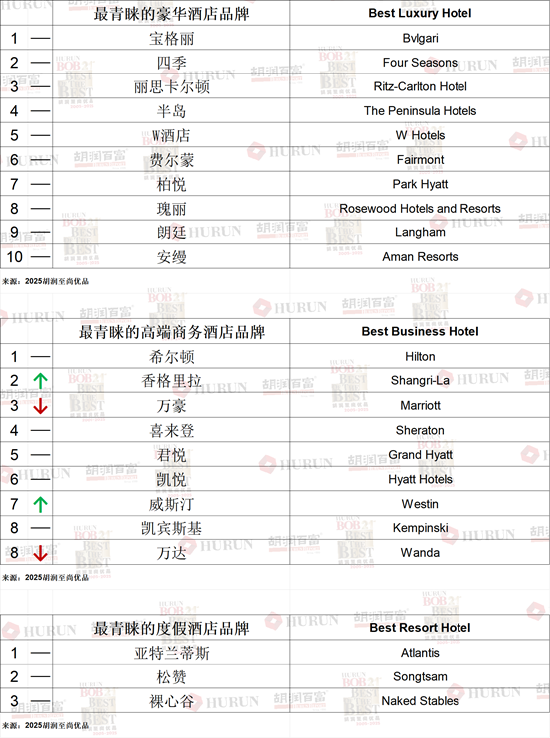 度假酒店方面,亚特兰蒂斯荣登最青睐品牌榜首,松赞和裸心谷紧随其后,分列第二、第三。