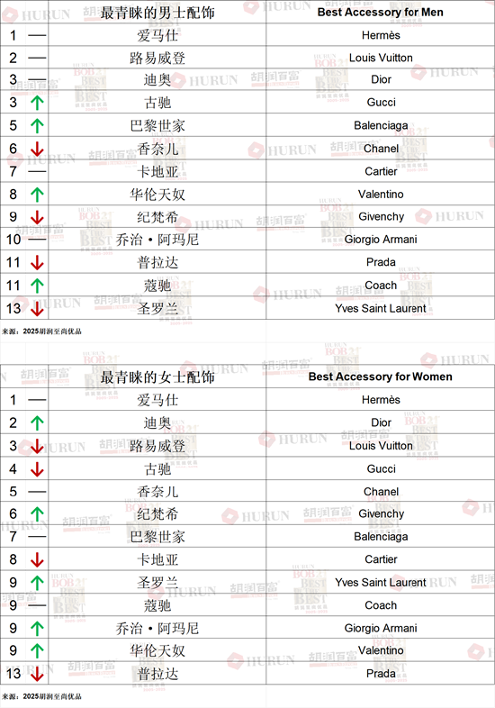 在女士配饰领域,爱马仕同样连续第四年位居第一,迪奥上升一位至第二。路易威登、古驰和香奈儿分列第三、第四和第五,纪梵希上升两位,排名第六。