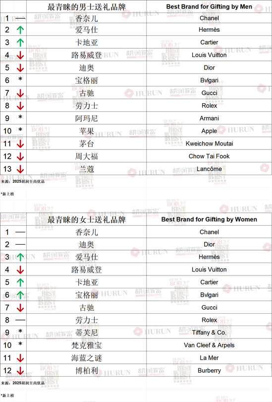 香奈儿继续稳居高净值人群最青睐的男士及女士送礼品牌。在男士送礼品牌中,爱马仕和卡地亚分别跃升至第二和第三位,宝格丽、阿玛尼和苹果跻身榜单,进入前十。在女士送礼品牌方面,迪奥蝉联第二,爱马仕超越路易威登,升至第三,而路易威登则下滑至第四。与此同时,蒂芙尼和梵克雅宝两大珠宝品牌成功进入榜单。