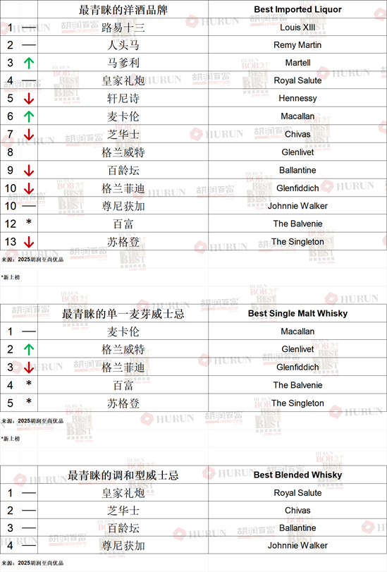 在洋酒品牌中,本次研究聚焦于干邑白兰地和威士忌。路易十三蝉联最青睐的洋酒品牌榜首,人头马位列第二,马爹利上升至第三。在单一麦芽威士忌中,麦卡伦蝉联第一,格兰威特和格兰菲迪分别排名第二和第三。百富首次上榜,排名第四,苏格登位列第五。皇家礼炮连续三年稳居最青睐的调和型威士忌品牌榜首。