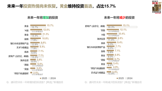 受访高净值人群未来一年投资热情持平,黄金保持首选,占比15.7%;其次是A股和基金,分别占比12%和11.3%。值得一提的是,保险上升2.9%,增长至10.8%。未来一年减少投资的意愿,房地产投资(含住宅、商铺)仍占15.1%,较去年投资热度稍有恢复,但仍位列减少投资类目第一位。