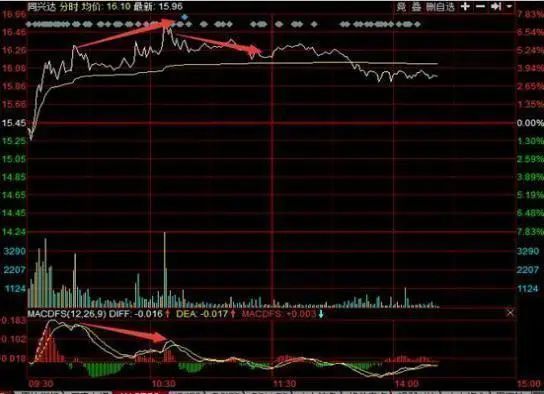 在上涨趋势中说了盘中看涨信号,现在说一下如何在盘中看跌,还是看分时走势与MACD指标,不过这次是看它们的顶背离,当分时走势与MACD指标形成顶背离时,股价会出现一波下跌行情。