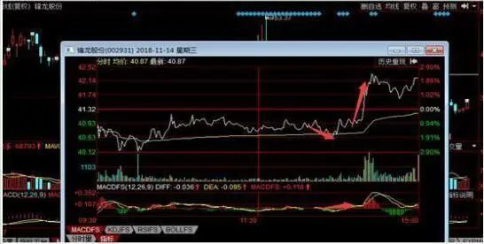 首先先教大家一个成功率非常高的盘中看涨信号,看分时走势与MACD指标底背离情况,当分时走势与MACD形成底背离时,股价会出现上涨行情。