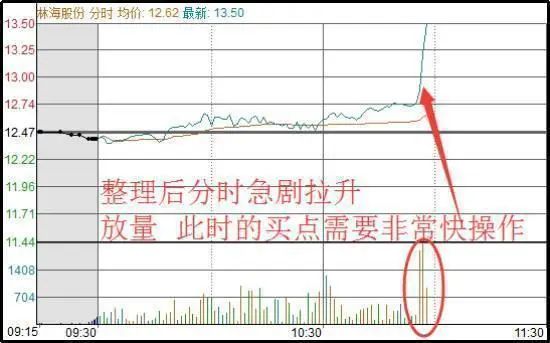 3、整理后突现急剧放量的动作,分时直线拉升,属于主力做多的体现,买入(做T低吸)信号。