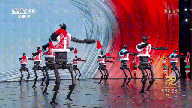 2025年央视春晚,一群身披花袄的机器人扭着秧歌登上舞台