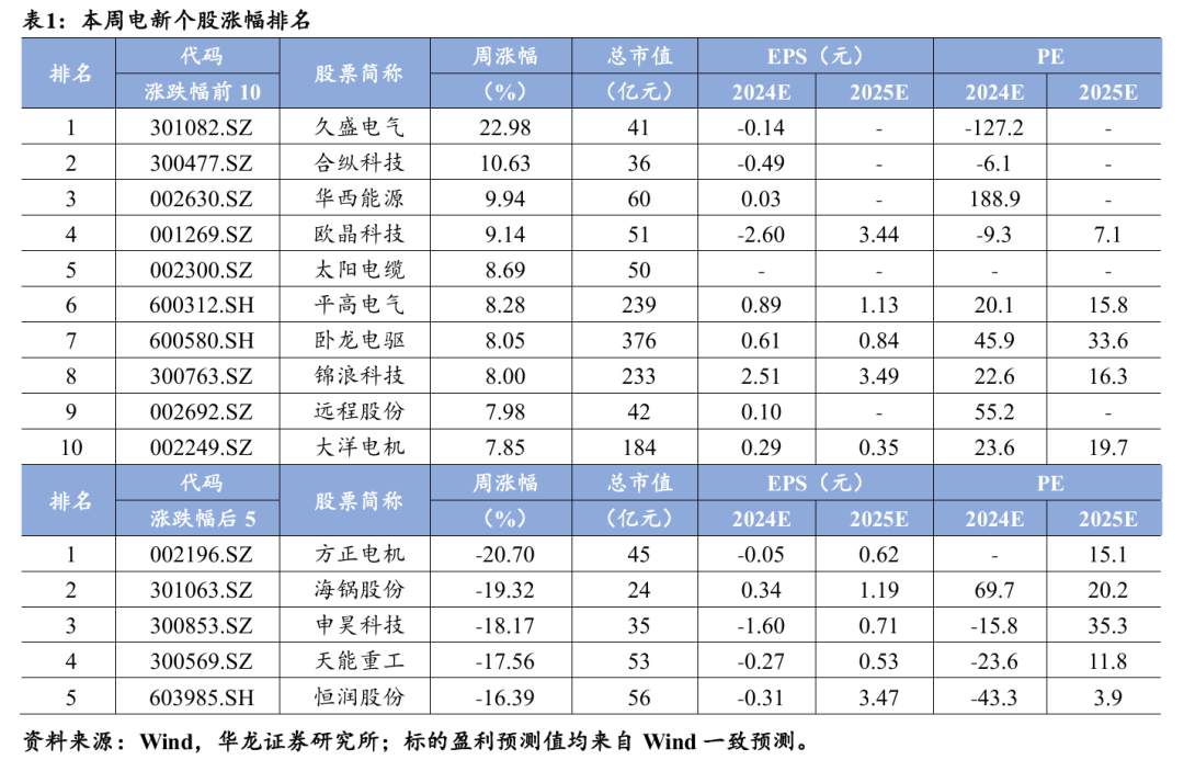 电新个股方面,本周56只个股上涨,284只个股下跌,涨幅前五的个 股为久盛电气、合纵科技、华西能源、欧晶科技、太阳电缆。