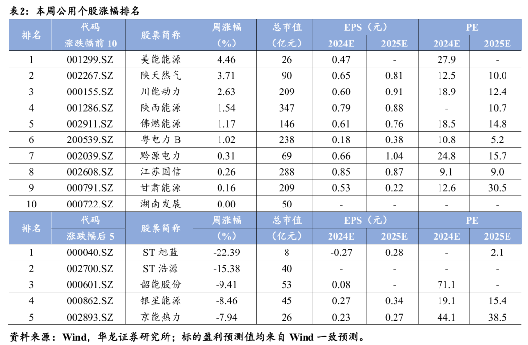 公用个股方面,本周9只个股上涨,42只个股下跌,涨幅前五的个股 为美能能源、陕天然气、川能动力、陕西能源、佛燃能源。