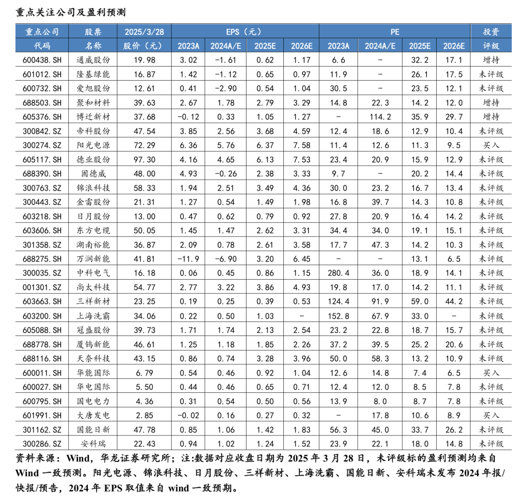 光伏涨价有所收敛,风电项目进展加快,钠电池产业化加速,国家能 源局核发绿证加速,维持行业“推荐”评级。个股方面,建议关注效率领 先的光伏电池龙头爱旭股份、隆基绿能、通威股份等,铜代银技术领先的 博迁新材、聚和材料、帝科股份,盈利性较强的逆变器环节阳光电源、德 业股份、固德威、锦浪科技等。风电板块建议关注具备涨价预期的零部件 金雷股份、日月股份;海缆东方电缆等。锂电建议关注铁锂和负极环节湖 行业研究报告 请认真阅读文后免责条款 13 南裕能、万润新能、中科电气、尚太科技等,以及固态电池电解质三祥新 材、上海洗霸、冠盛股份、厦钨新能,碳纳米管天奈科技等。公用事业建 议关注火电公司华能国际,华电国际,国电电力,大唐发电等;电力it建 议关注国能日新、安科瑞。