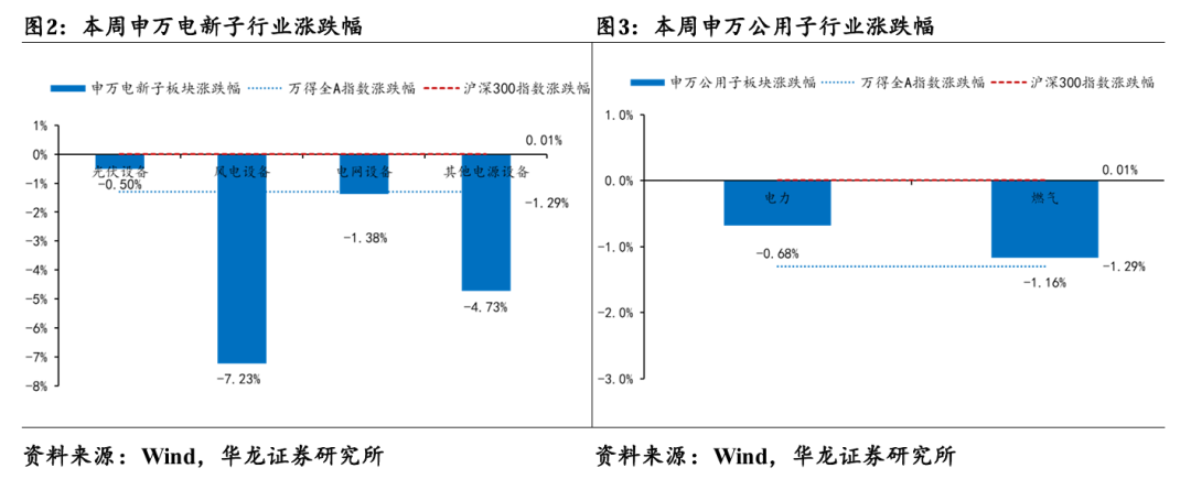 行业方面,2025.3.22-3.28(后文均简称本周)申万电新板块涨跌幅-1.70%,涨跌幅在 31 个行业中排名第 17;申万公用板块涨跌幅-0.73%, 涨跌幅在31个行业中排名第11。同期沪深300涨跌幅+0.01%,万得全A 涨跌幅-1.29%。