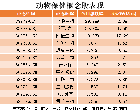 截至收盘,永顺生物(839729.BJ)30CM涨停,金河生物(002688.SZ)走出6天3板,绿康生化(002868.SZ)等多股涨停,回盛生物(300871.SZ)接近20CM涨停,普莱柯(603566.SH)等跟涨。