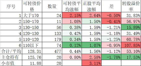 477只可转债平均上涨0.44%;对应正股平均上涨1.56%;我的主仓20只可转债平均上涨0.80%,对应正股平均上涨2.58%。今天可转债严重跟不上正股涨幅。