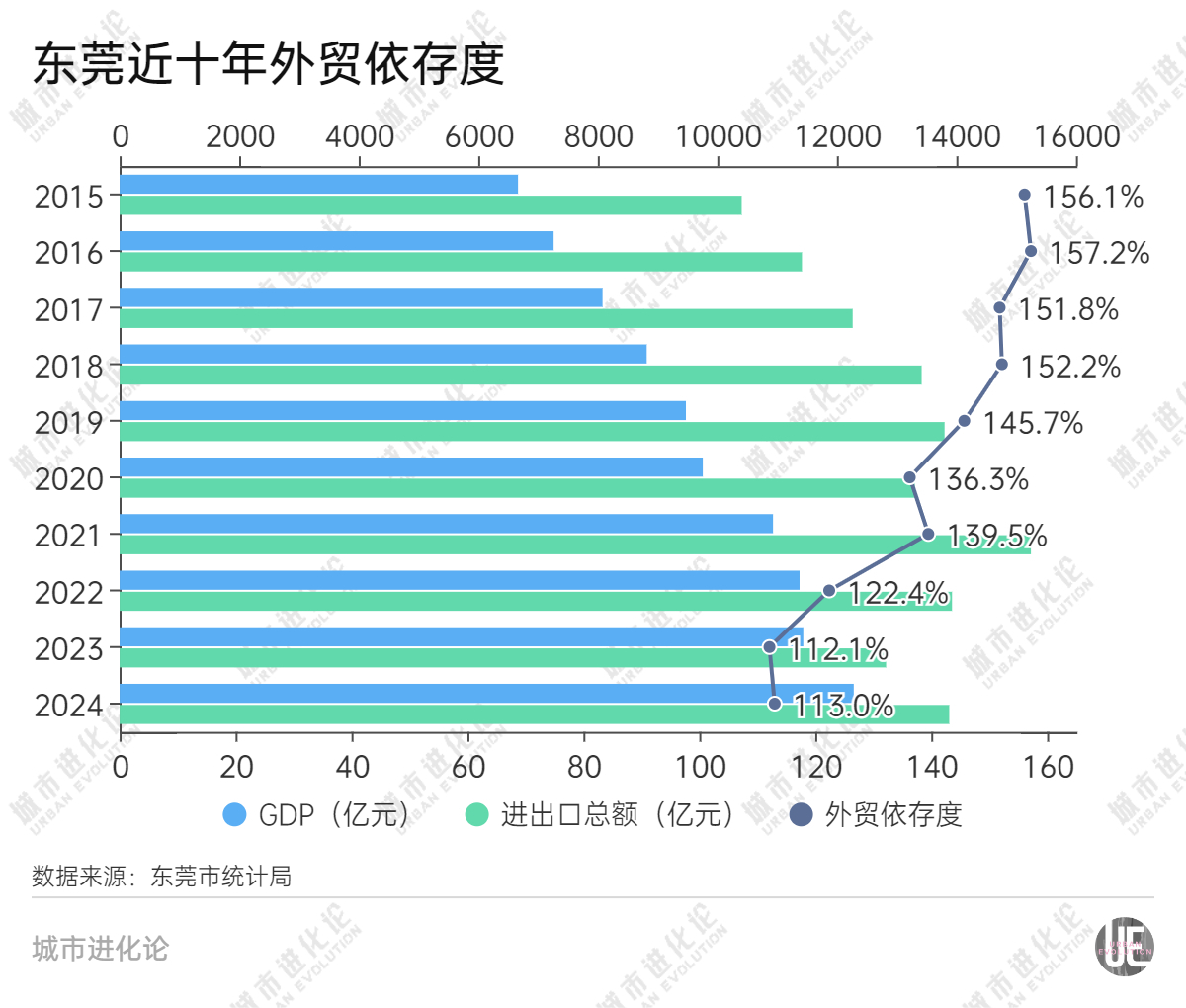 图片来源:财经智库以“进出口总额/GDP”计算,东莞外贸依存度一度超过400%。2024年,这个数字降至113%,相比前些年有明显下降,但仍是全国外贸依存度最高的城市之一,在万亿城市中仅次于深圳(122.4%)。