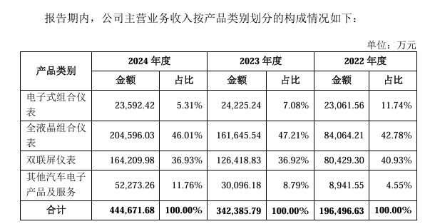 公司主要从事汽车仪表的研发设计、生产、销售和服务,并逐步向智能座舱领域拓展。公司主要产品包括电子式组合仪表、全液晶组合仪表、双联屏仪表及其他汽车电子产品与服务。自设立以来,公司始终以汽车仪表产品为核心,把握汽车智能化发展趋势,坚持客户需求导向,持续开发迭代,具备成熟的汽车仪表等汽车电子产品研发能力、生产能力和服务保障能力。