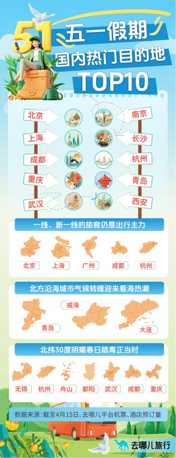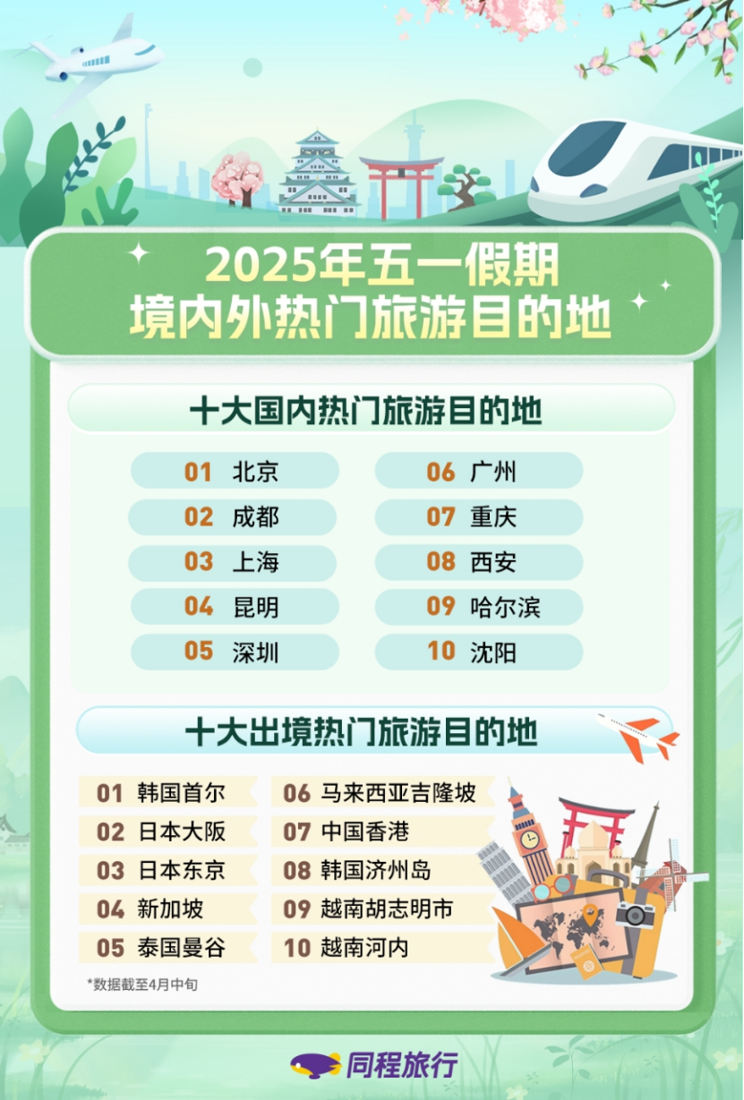 4月15日,同程旅行发布《2025年“五一”旅游趋势洞察报告》显示,今年“五一”假期,以非一线城市用户为代表的大众旅游需求,将持续推动假日经济蓬勃发展。“五一”假期的旅行热度或将达到2023年以来“五一”假期的峰值,出行高峰预计出现在假期前两日。“五一”假期市场将呈现本异地市场供需两旺,品质休闲度假趋势走强的特征。