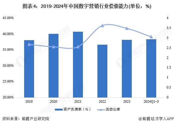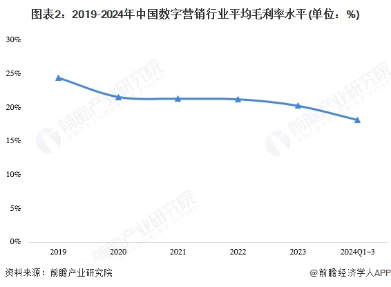 从盈利能力来看,中国数字营销行业的平均毛利率波动中略有下行,主要与宏观经济环境边际修复不及预期存在一定联系,由于下游厂商经营情况不佳,导致企业在营销投放上的预算减少,产品单价的降低是行业毛利率水平下降的主要原因。截至2024年第三季度,数字营销行业的平均毛利率水平回落至18.21%。