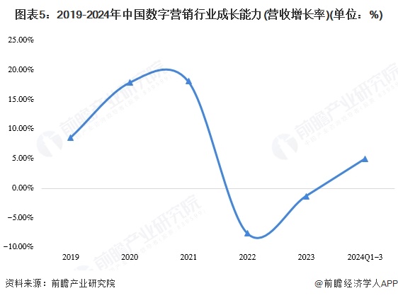 从数字营销行业的成长能力来看,2019-2023年,我国数字营销行业的营业收入增长率呈现先上升后下滑,最后回升的趋势,其中2019-2021年期间行业营收增长主要与疫情影响,下游市场景气度降至低点存在联系。随着宏观经济形势的企稳,数字营销行业营收增速逐步回温,行业发展有望企稳。