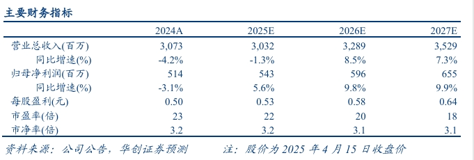 公司发布2024年年报。24年实现总营收30.73亿元,同比-4.2%;归母净利润5.14亿元,同比-3.1%;24Q4实现营收7.85亿元,同比-10.3%;归母净利润1.63亿元,同比+13.4%;25Q1实现营收8.31亿元,同比-7.1%;归母净利润1.61亿元,同比+3.7%。 公司拟每10 股派息5.0元(含税),对应股息率4.13%。