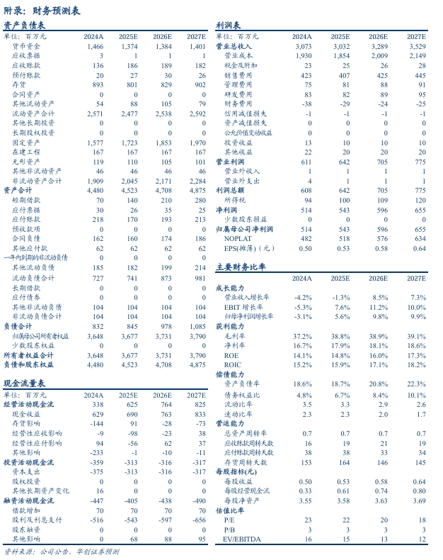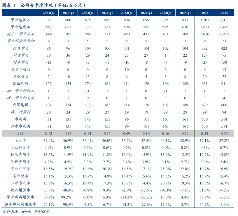 24全年盈利同比基本持平,而24Q4及25Q1毛利率优化带动盈利向上改善。24全年公司毛利率37.2%,同比+0.1pcts,其中上半年毛利率同比下滑,而下半年伴随产品结构调整、成本进一步回落,毛利率同比均有一定提升。在费用端,销售费率同比+1.6pcts,公司适当加大促销及广宣费用,管理费用率同比-1.5pcts,主要系股份支付费用明显减少,而其他费用方面基本平稳,最终公司归母净利润率同比基本持平。25Q1公司毛利率38.9%,同比+2.9pcts,而销售费用率/管理费用率同比+0.6pcts/持平,最终归母净利润率录得19.3%,同比+2.0pcts。
