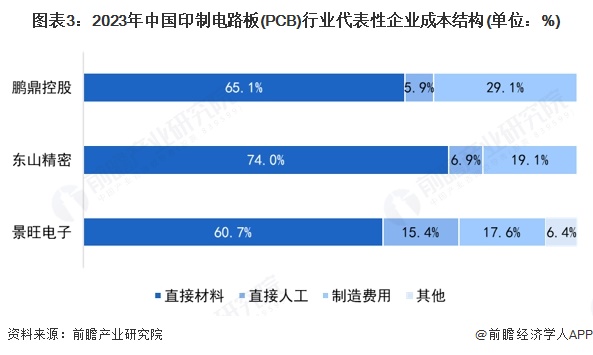 印制电路板(PCB)的成本主要由原材料、人工成本、制造费用构成。前瞻统计了印制电路板(PCB)行业领先企业的产品成本数据,可以看出,原材料占印制电路板(PCB)行业的成本比重最大,基本在60%以上。