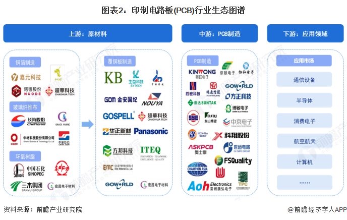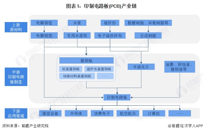 从产业链环节来看,印制电路板(PCB)上游主要为铜箔、铜箔基板、玻纤布、树脂等原材料行业;中游为印制电路板(PCB)制造环节,是指通过蚀刻等工艺将覆铜板制作成PCB板的过程;下游主要为印制电路板(PCB)应用领域,包括通信、光电、消费电子、汽车、航空航天、军用、工业精密仪表等领域。