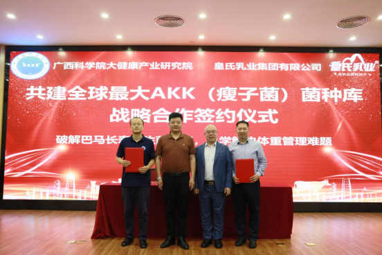 在皇氏集团联席总裁、皇氏乳业集团总经理王鹤飞,广西科学院大健康研究所所长、大健康产业研究院院长李京及与会人员的共同见证下,双方签署共建“全球最大的AKK(瘦子菌)菌种库”战略合作协议,以科技力量推动体重管理事业发展,助力健康中国,为国人的体重管理加油赋能!