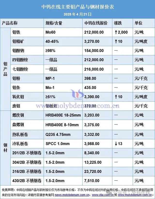 周初国内钼市整体行情略有好转,主要表现在主流产品价格继续小幅上涨、贸易商进场操作积极性升高与市场成交量有所增多等。今日,钼精矿、钼铁与七钼酸铵价格分别约为3,270元/吨度、212,000元/吨和216,000元/吨。近日,进场招标钼铁的钢材企业有首钢京唐,中国一重,中原特钢,山钢莱芜,河北普阳,河钢集团等;钢招价格约20.8万元/吨。